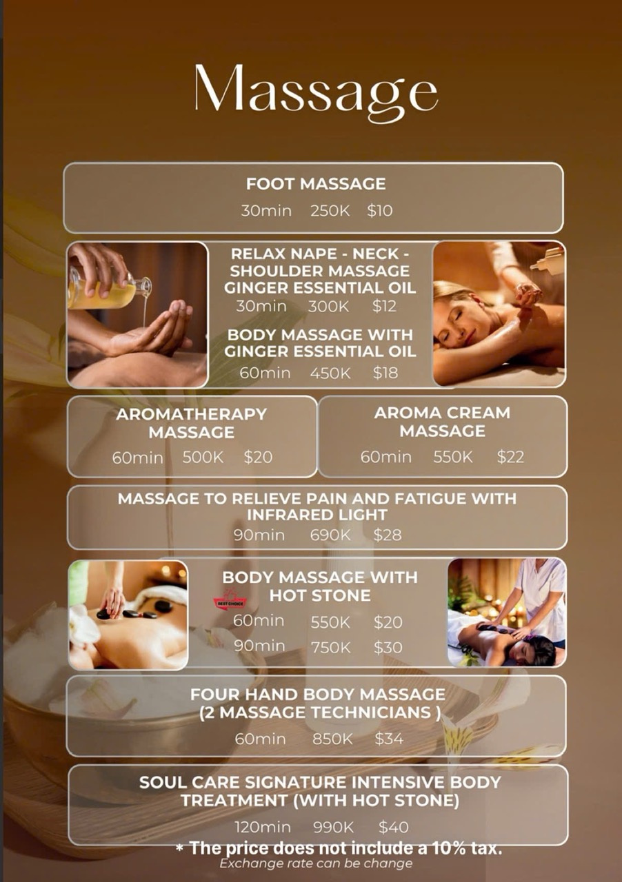 – 90 minutes – 750K - Healing Meridian Pressure Point Massage with Hot Stones: 120 minutes – 990K